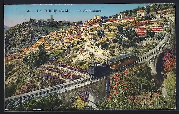 AK La Turbie, Le Funiculaire, Bergbahn zwischen bunten Blumen