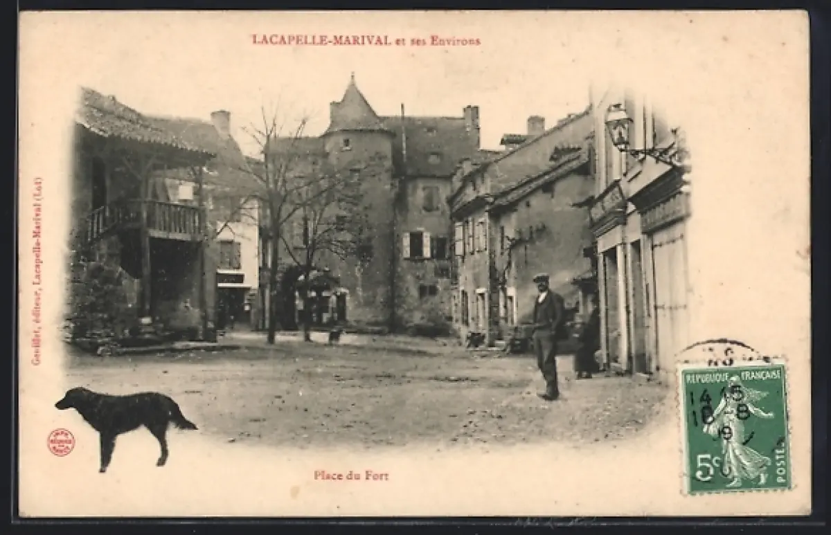 AK Lacapelle-Marival, Place du Fort avec un chien et des bâtiments historiques