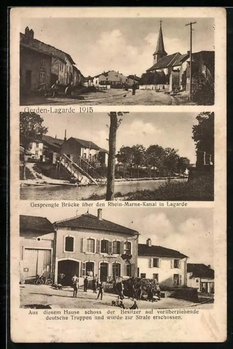 AK Lagarde, gesprengte Brücke, Orts- und Gebäudeansichten
