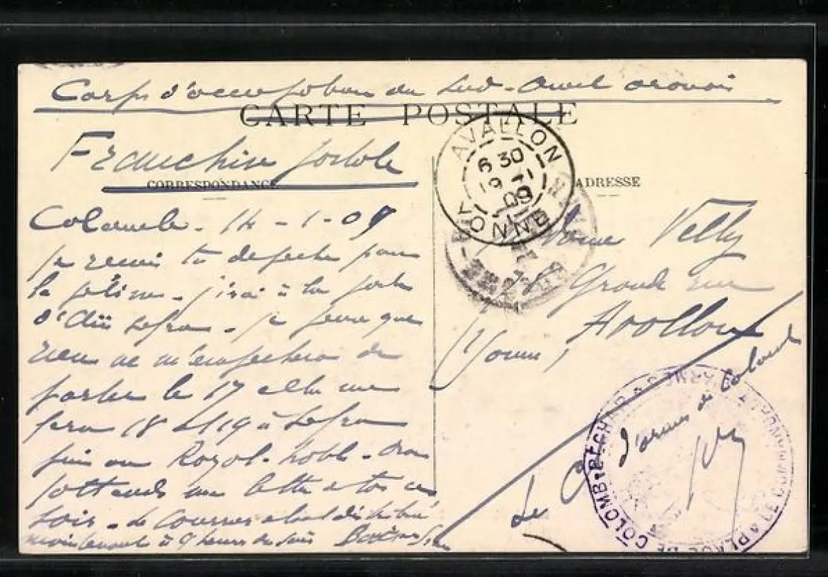 Personenbezogene Daten auf der Rückseite der Karte wurden durch blauen Textmarker unkenntlich gemacht. Die blauen Stellen sind auf die Vorderseite durchgeweicht und wirken sich negativ auf das Postkartenfoto aus