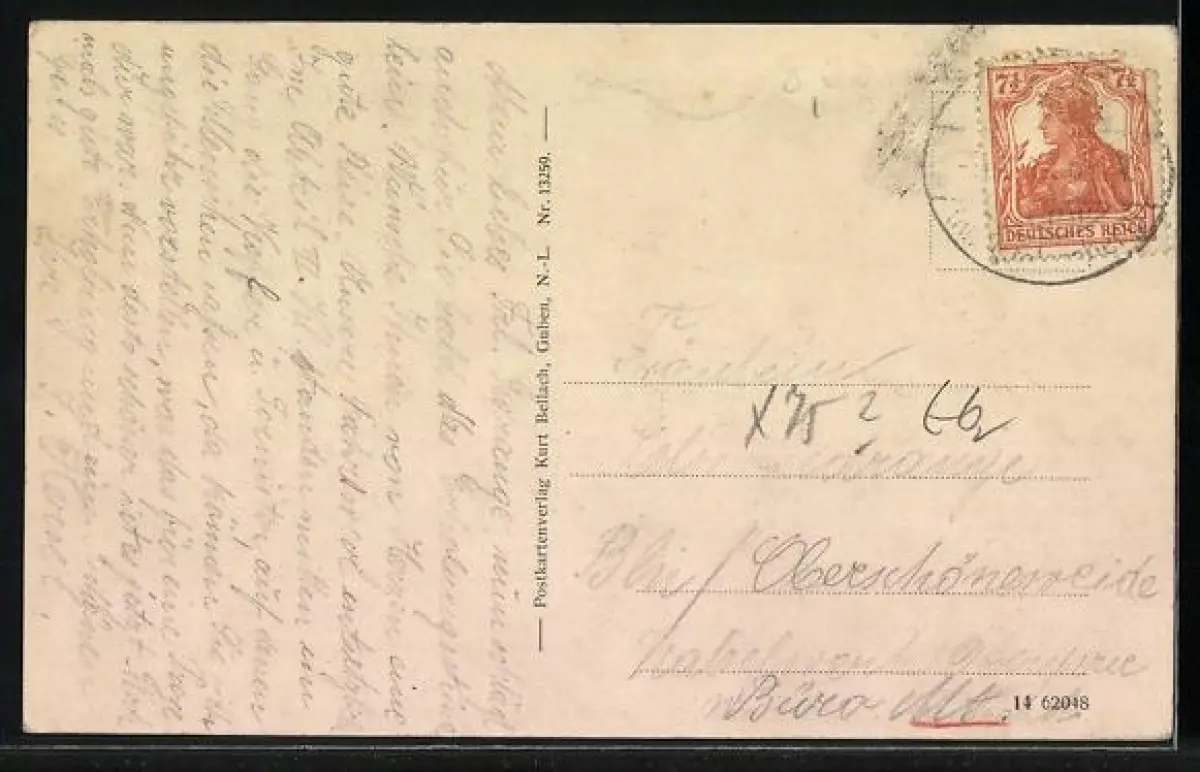 Personenbezogene Daten auf der Rückseite der Karte wurden durch blauen Textmarker unkenntlich gemacht. Die blauen Stellen sind auf die Vorderseite durchgeweicht und wirken sich negativ auf das Postkartenfoto aus