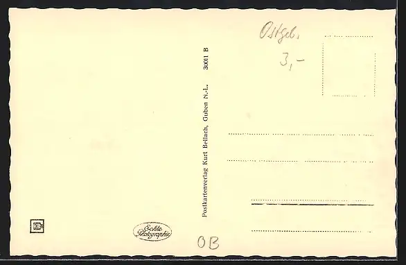 Personenbezogene Daten auf der Rückseite der Karte wurden durch blauen Textmarker unkenntlich gemacht. Die blauen Stellen sind auf die Vorderseite durchgeweicht und wirken sich negativ auf das Postkartenfoto aus