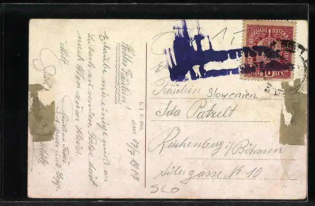alte Ansichtskarte, gelaufen 1917, Stempelspur, rückseitig Klebe- und Papierreste, rückseitig Oberflächenschaden, guter Zustand