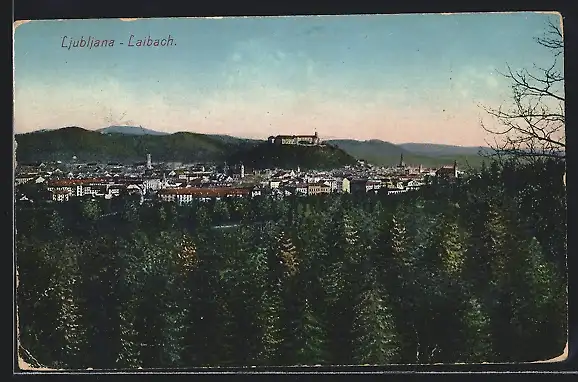 AK Laibach, Ortsansicht mit Feste in der Dämmerung