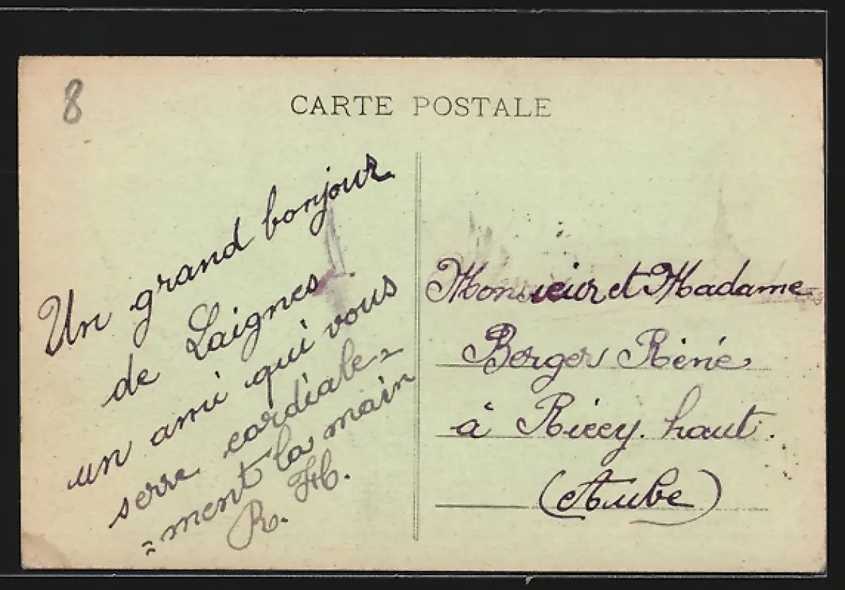 Personenbezogene Daten auf der Rückseite der Karte wurden durch blauen Textmarker unkenntlich gemacht. Die blauen Stellen sind auf die Vorderseite durchgeweicht und wirken sich negativ auf das Postkartenfoto aus