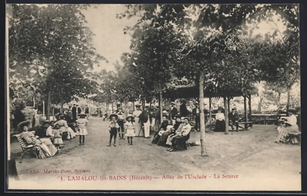 AK Lamalou-les-Bains /Hérault, Allée de l`Uscalde, La Source, animation de promeneurs et familles