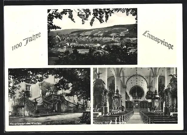 AK Lamspringe, Hauptportal des Klosters, Inneres der Klosterkirche und Gesamtansicht