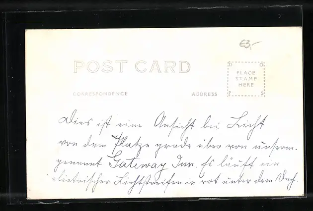 Personenbezogene Daten auf der Rückseite der Karte wurden durch blauen Textmarker unkenntlich gemacht. Die blauen Stellen sind auf die Vorderseite durchgeweicht und wirken sich negativ auf das Postkartenfoto aus