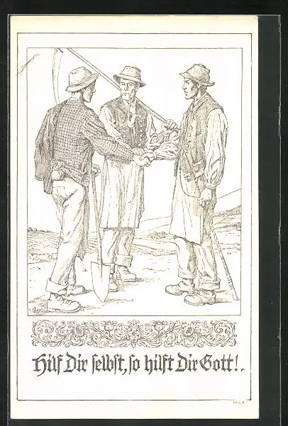 AK Landarbeiter geben sich die Hand, Hilf dir selbst, so hilft dir Gott