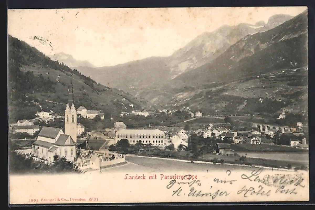 AK Landeck, Totalansicht mit Parseiergruppe aus der Vogelschau