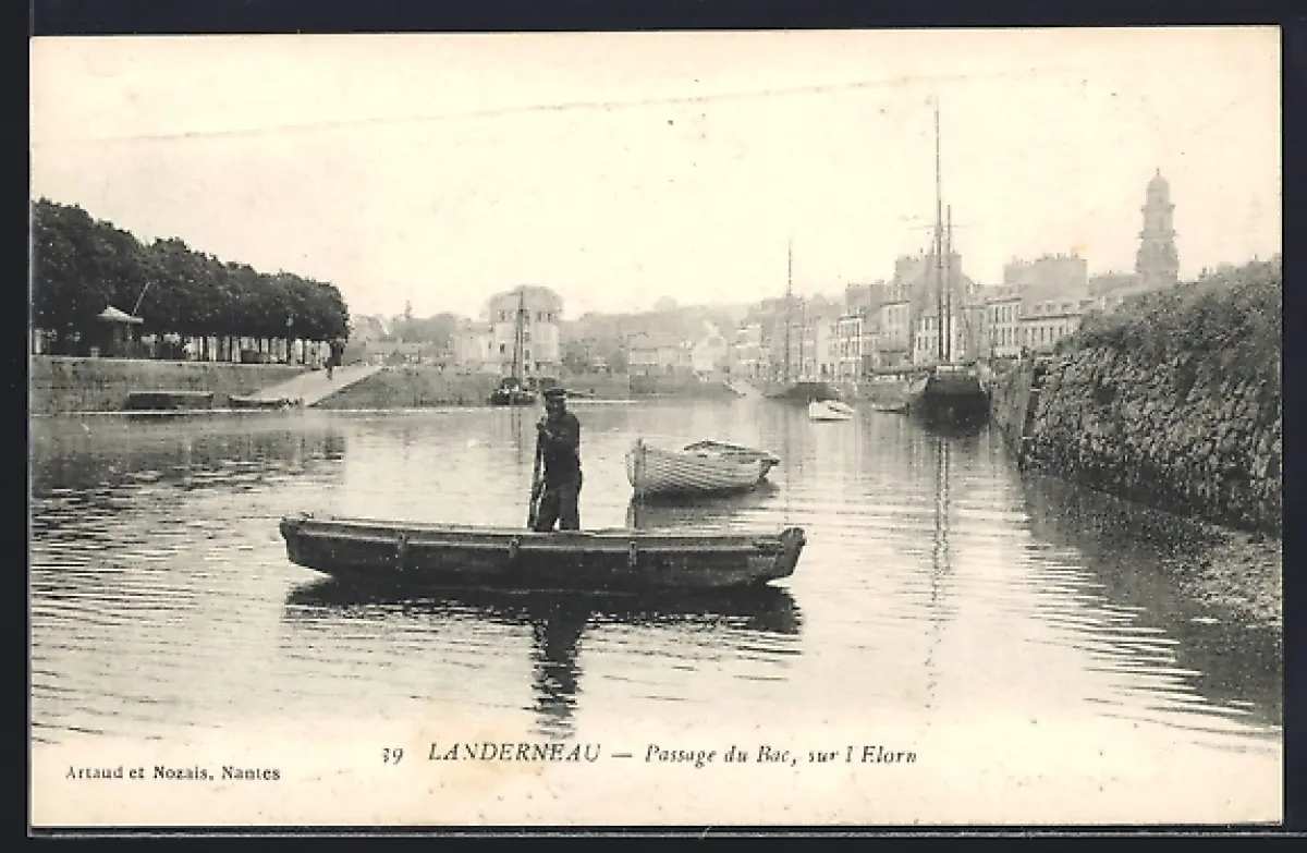 AK Landerneau, Passage du Bac sur l`Elorn avec vue sur la ville et bateaux amarrés