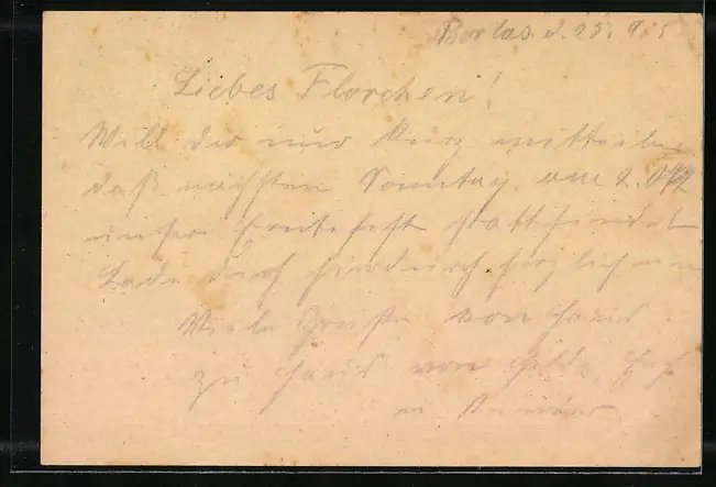 Personenbezogene Daten auf der Rückseite der Karte wurden durch blauen Textmarker unkenntlich gemacht. Die blauen Stellen sind auf die Vorderseite durchgeweicht und wirken sich negativ auf das Postkartenfoto aus