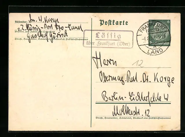 AK Landpoststempel Lässig über Frankfurt (Oder)