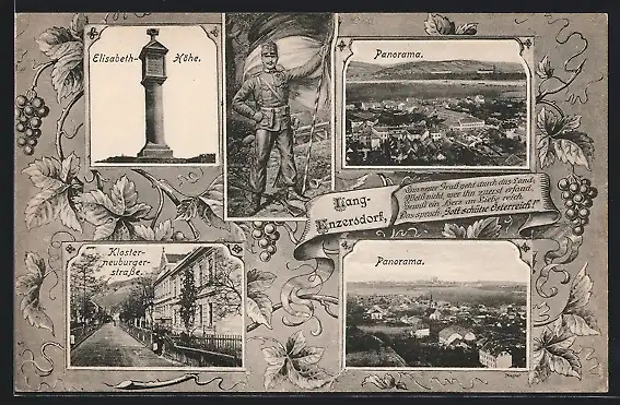 AK Lang-Enzersdorf, Klosterneuburgerstrasse, Elisabeth-Höhe, Soldat mit Flagge, Panorama