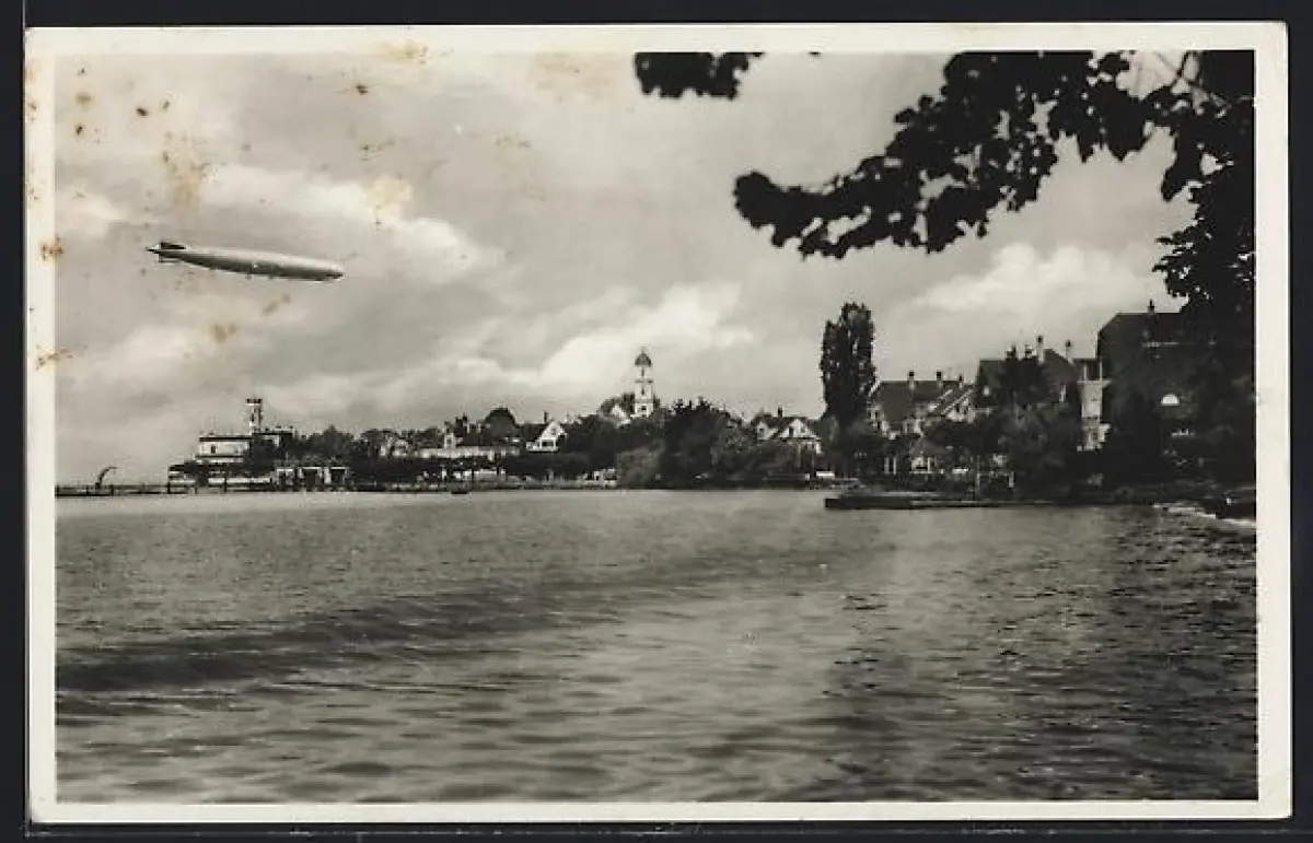 AK Langenargen am Bodensee, Ortsansicht mit Zeppelin