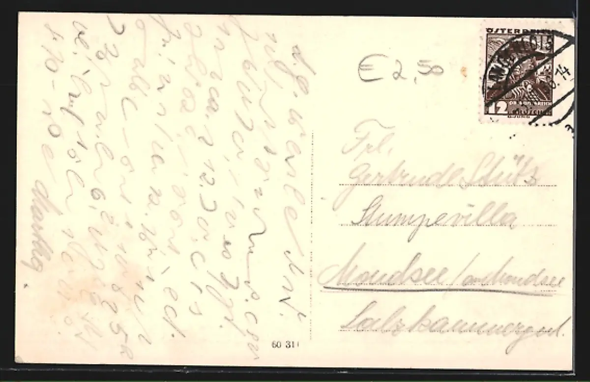 Personenbezogene Daten auf der Rückseite der Karte wurden durch blauen Textmarker unkenntlich gemacht. Die blauen Stellen sind auf die Vorderseite durchgeweicht und wirken sich negativ auf das Postkartenfoto aus