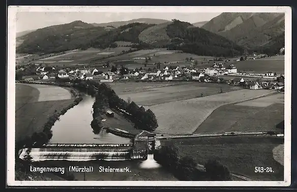 AK Langenwang, Ortsansicht mit Kirche und Bergpanorama, Flusswehr