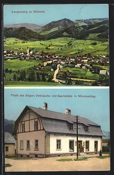 AK Langenwang, Panorama, Filiale des Allgem. Verbrauchs- und Sparvereins in Mürzzuschlag