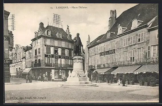 AK Langres, Place Diderot avec statue et bâtiments historiques