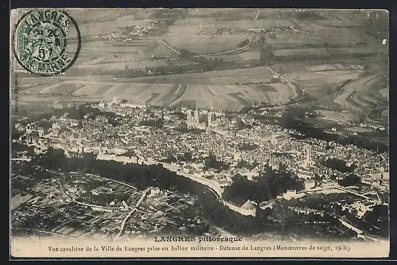 AK Langres, Vue cavalière de la Ville prise en ballon militaire, Défense de Langres, Manoeuvres de siège, 1906