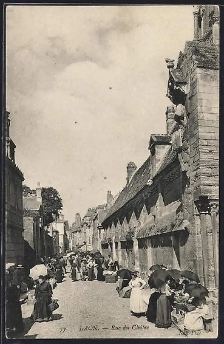 AK Laon, Rue du Cloître animée avec passants et gargouilles sculptées
