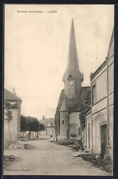 AK Laons, Vue de l`église avec clocher et maisons adjacentes