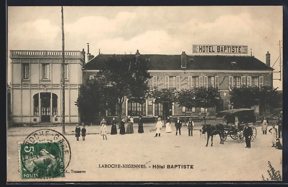AK Laroche-Migennes, Hôtel BAPTISTE et place animée avec passants et calèche