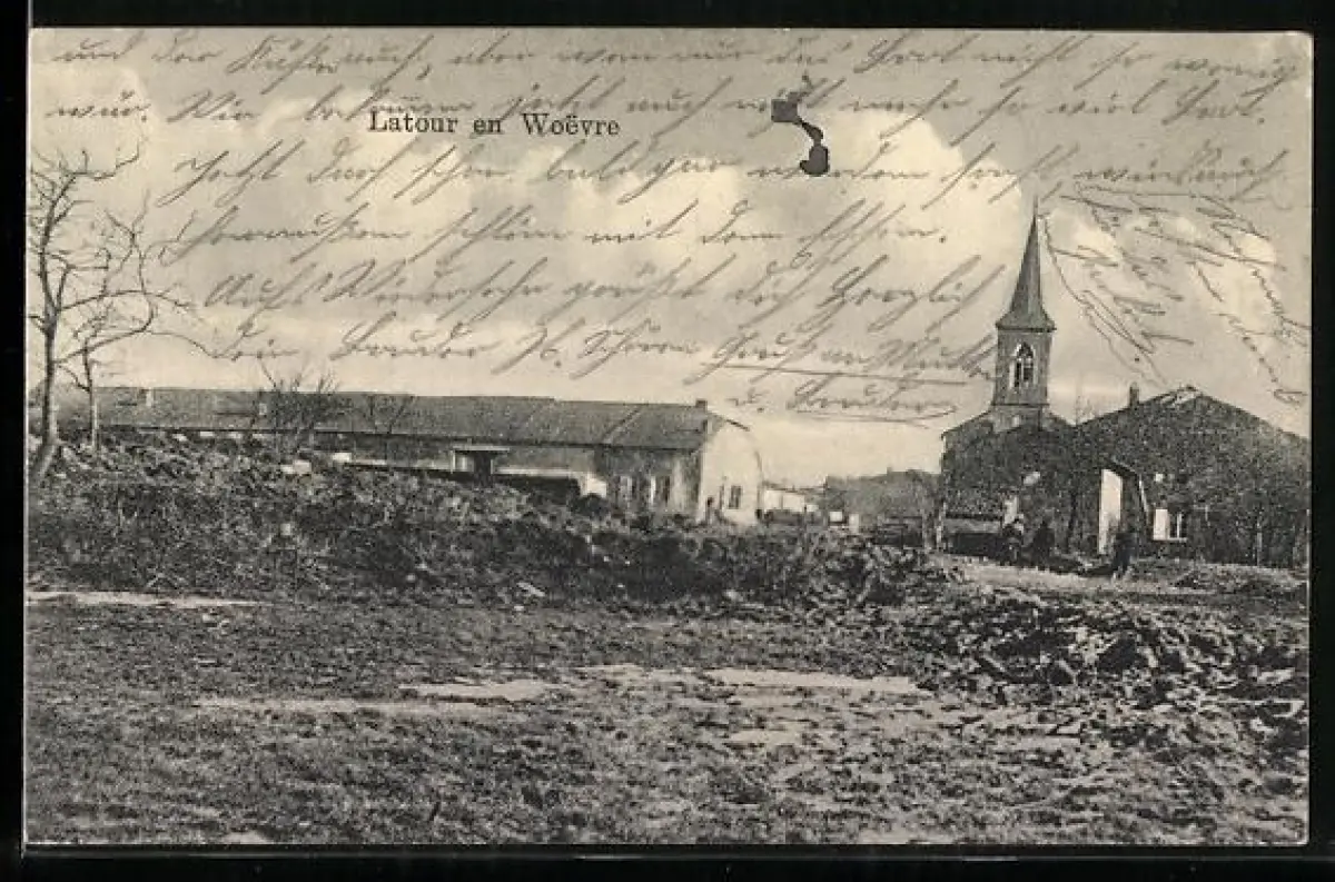 AK Latour en Woëvre, Vue de l`église et des bâtiments environnants en hiver