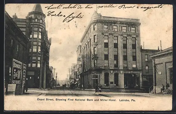 AK Latrobe, PA, Depot Sreet, Showing First National Bank and Miller Hotel