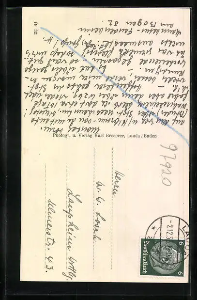 Personenbezogene Daten auf der Rückseite der Karte wurden durch blauen Textmarker unkenntlich gemacht. Die blauen Stellen sind auf die Vorderseite durchgeweicht und wirken sich negativ auf das Postkartenfoto aus