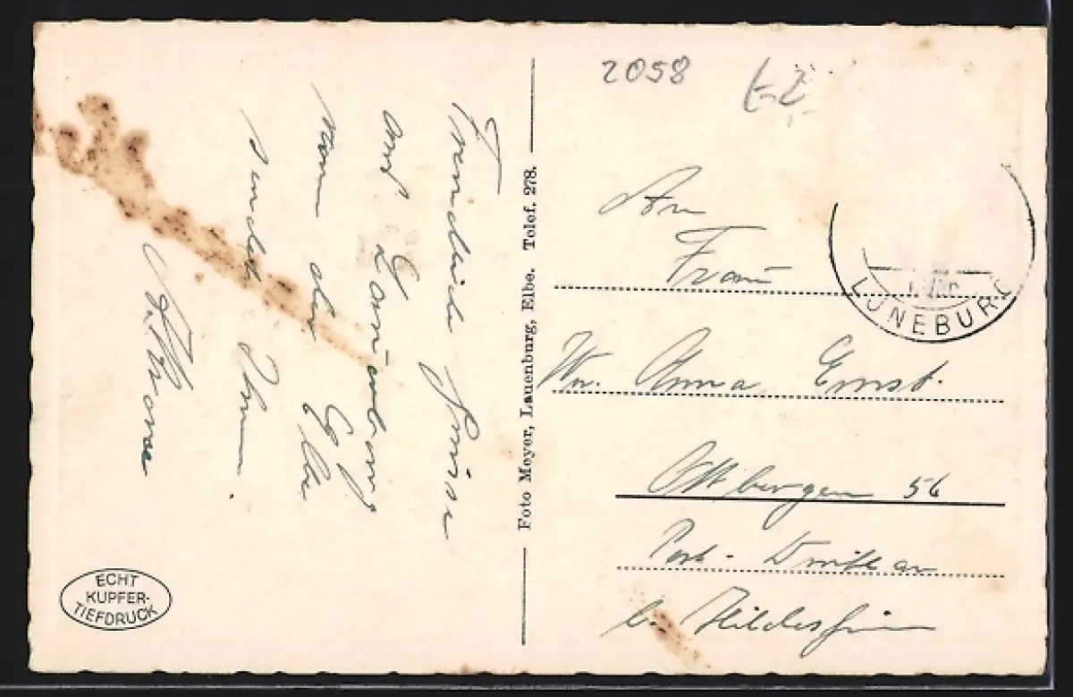 Personenbezogene Daten auf der Rückseite der Karte wurden durch blauen Textmarker unkenntlich gemacht. Die blauen Stellen sind auf die Vorderseite durchgeweicht und wirken sich negativ auf das Postkartenfoto aus