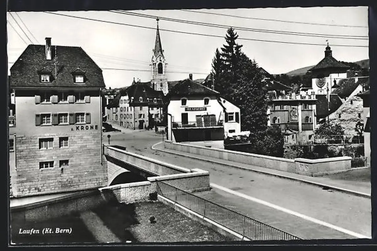 AK Laufen /Bern, Strassenpartie mit Metzgerei und Kirche