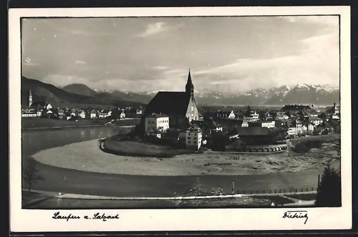 AK Laufen a. Salzach, Stadtansicht mit Kirche und Salzachschleife