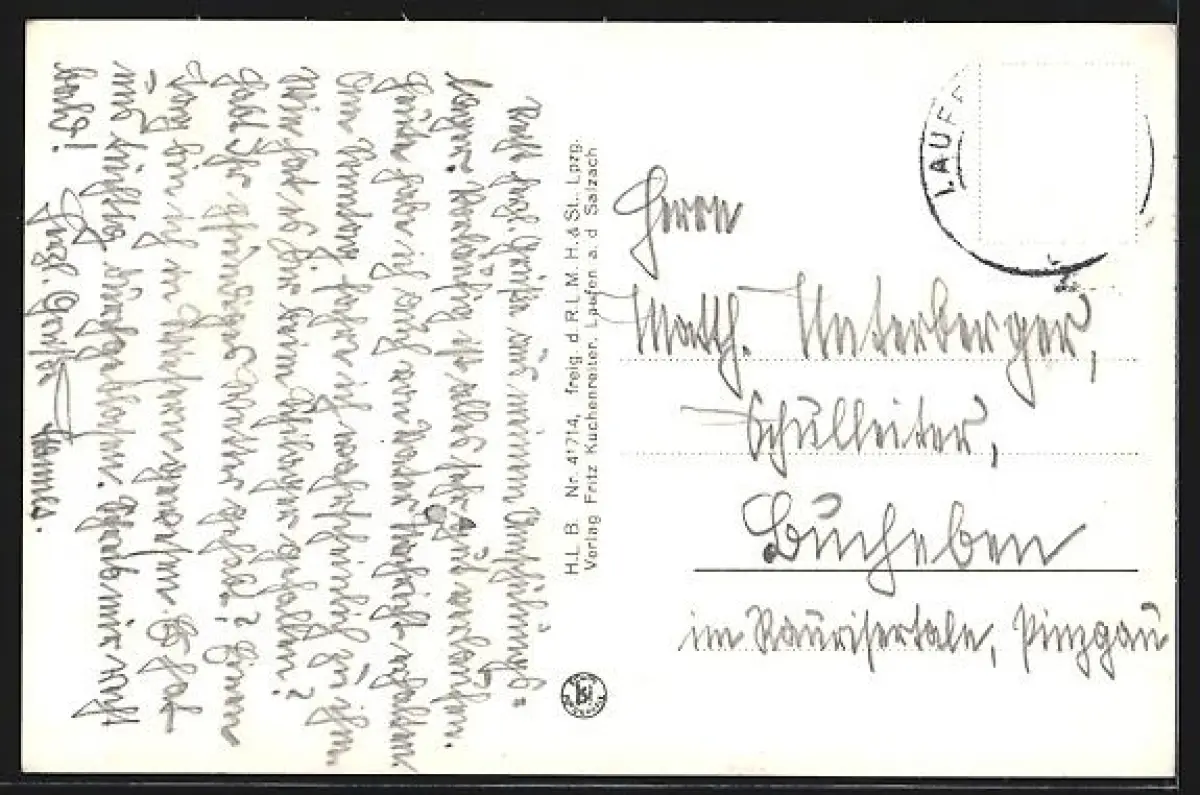 Personenbezogene Daten auf der Rückseite der Karte wurden durch blauen Textmarker unkenntlich gemacht. Die blauen Stellen sind auf die Vorderseite durchgeweicht und wirken sich negativ auf das Postkartenfoto aus