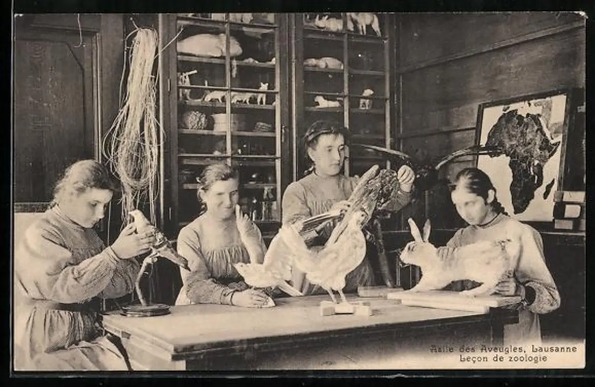 AK Lausanne, Asile des Aveugles, Lecon de zoologie, Schülerinnen im Biologieunterricht