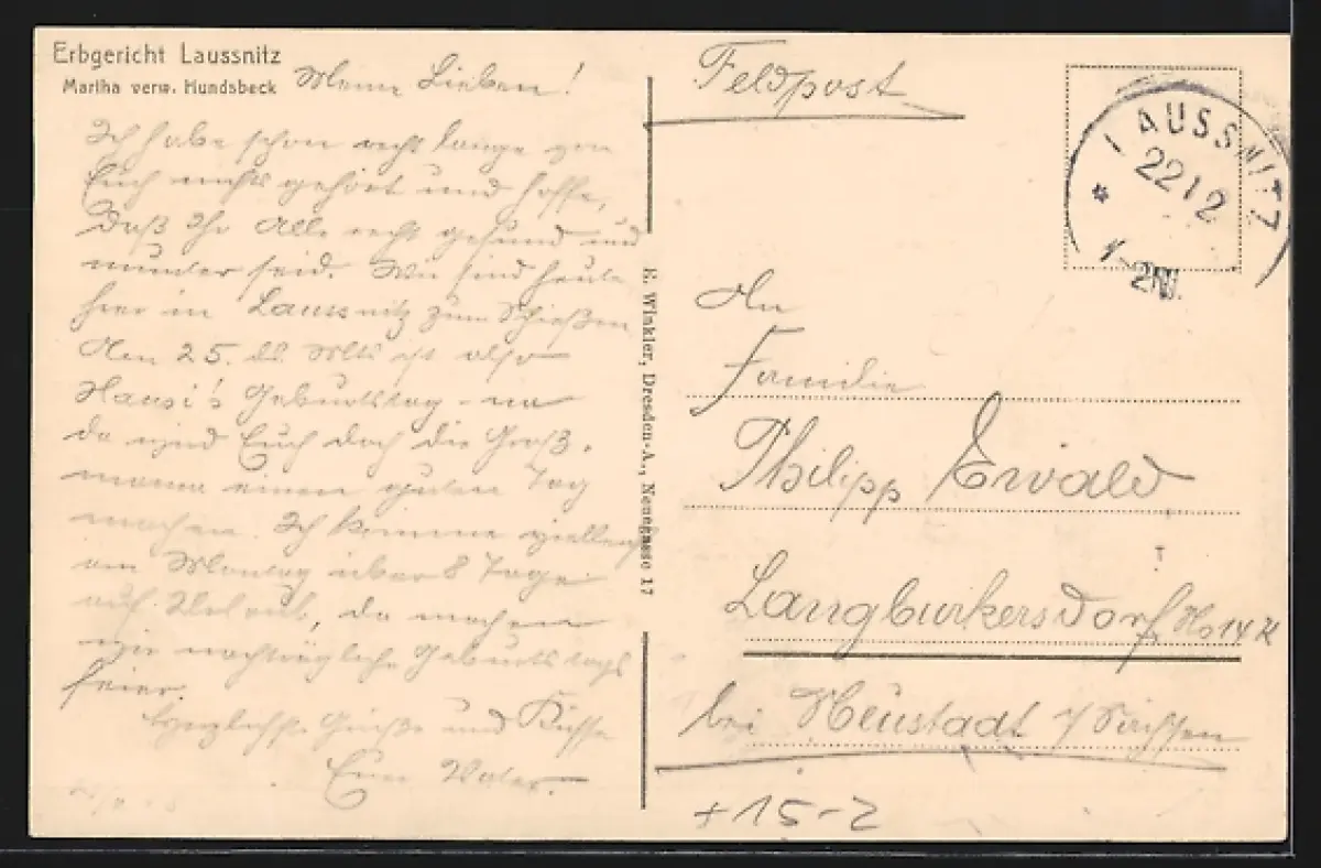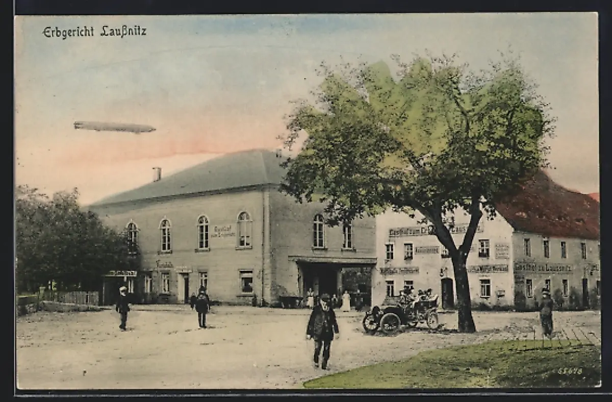 AK Laussnitz, Erbgericht mit Zeppelin im Hintergrund