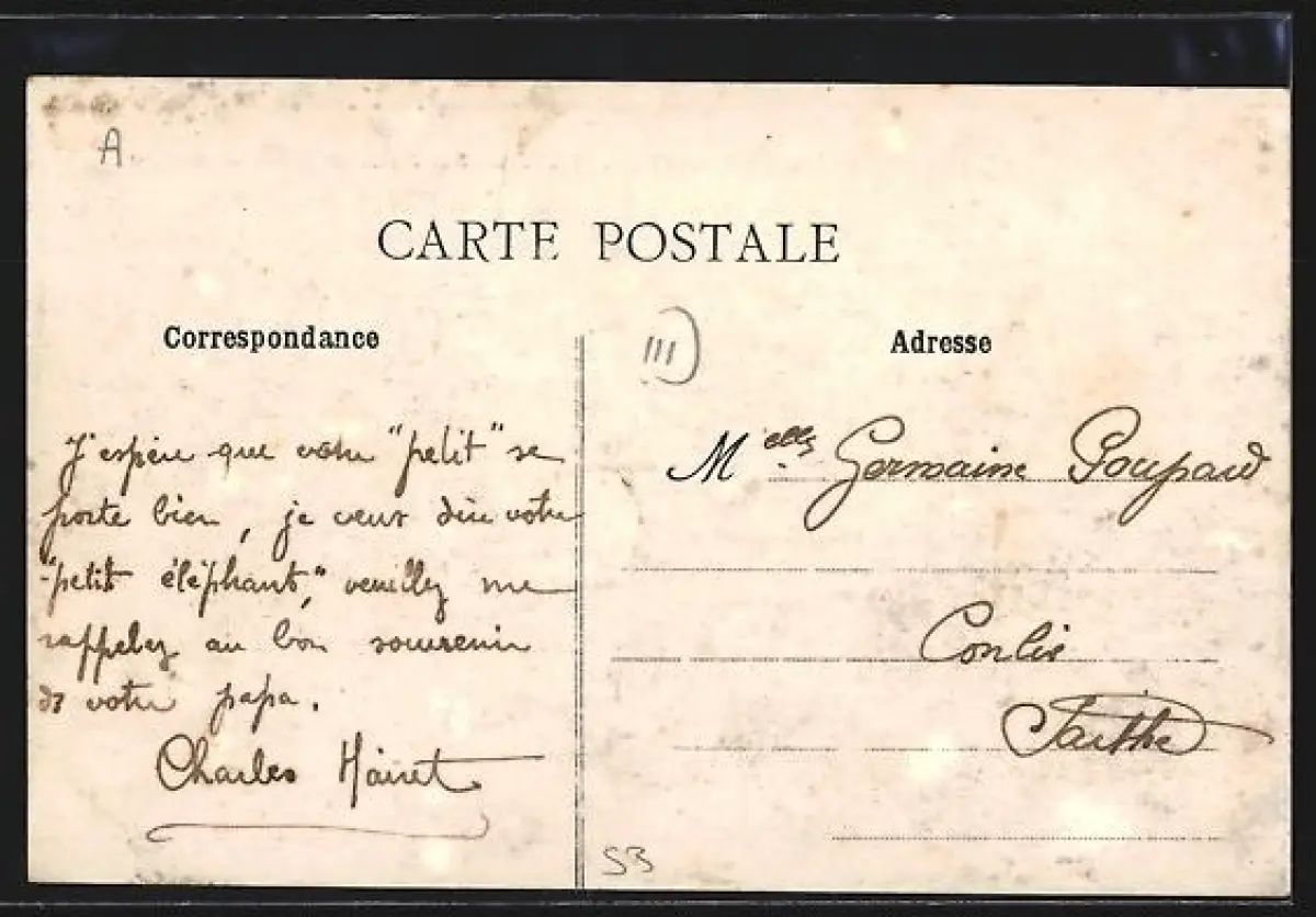 Personenbezogene Daten auf der Rückseite der Karte wurden durch blauen Textmarker unkenntlich gemacht. Die blauen Stellen sind auf die Vorderseite durchgeweicht und wirken sich negativ auf das Postkartenfoto aus