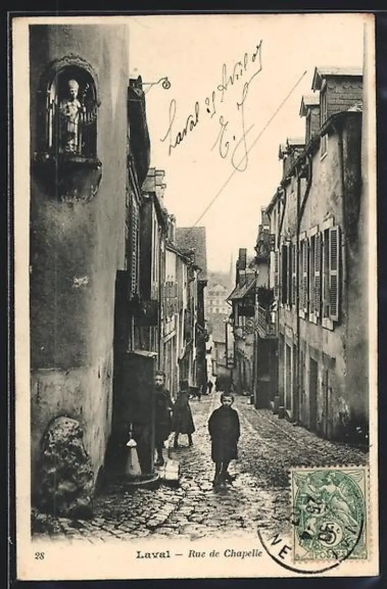 AK Laval, Rue de Chapelle avec passants et architecture historique