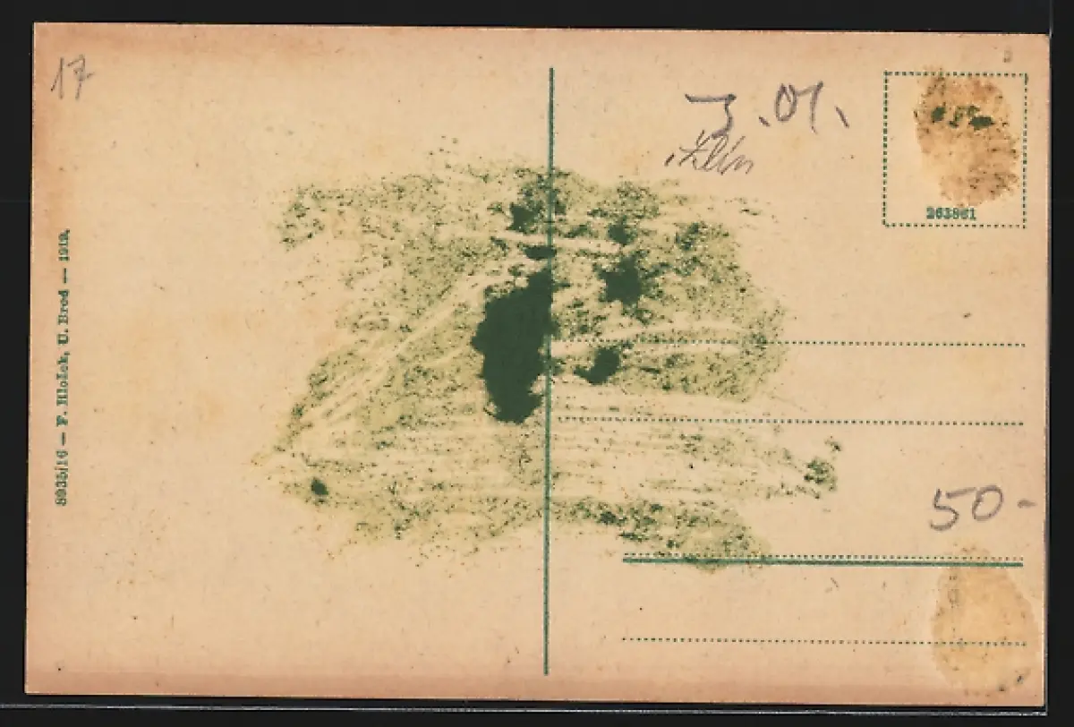alte Ansichtskarte, ungelaufen, rückseitig Klebe- und Papierreste, Stecknadellöcher li. u. re., guter Zustand