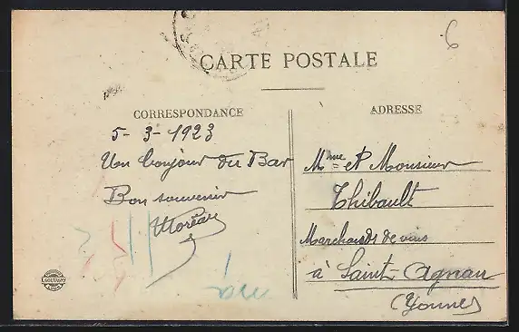 Personenbezogene Daten auf der Rückseite der Karte wurden durch blauen Textmarker unkenntlich gemacht. Die blauen Stellen sind auf die Vorderseite durchgeweicht und wirken sich negativ auf das Postkartenfoto aus