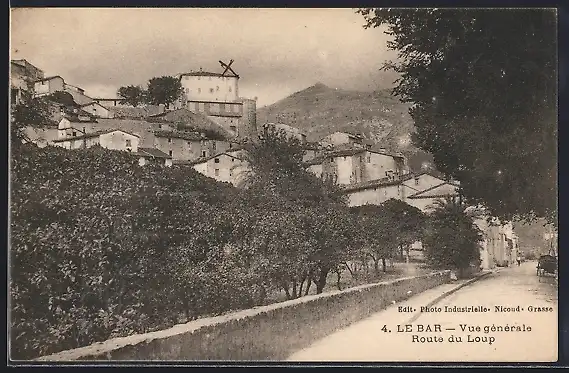 AK Le Bar-sur-Loup, Vue générale sur la Route du Loup et le moulin sur la colline
