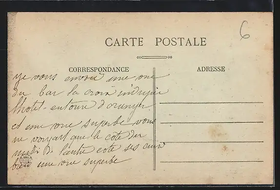 Personenbezogene Daten auf der Rückseite der Karte wurden durch blauen Textmarker unkenntlich gemacht. Die blauen Stellen sind auf die Vorderseite durchgeweicht und wirken sich negativ auf das Postkartenfoto aus