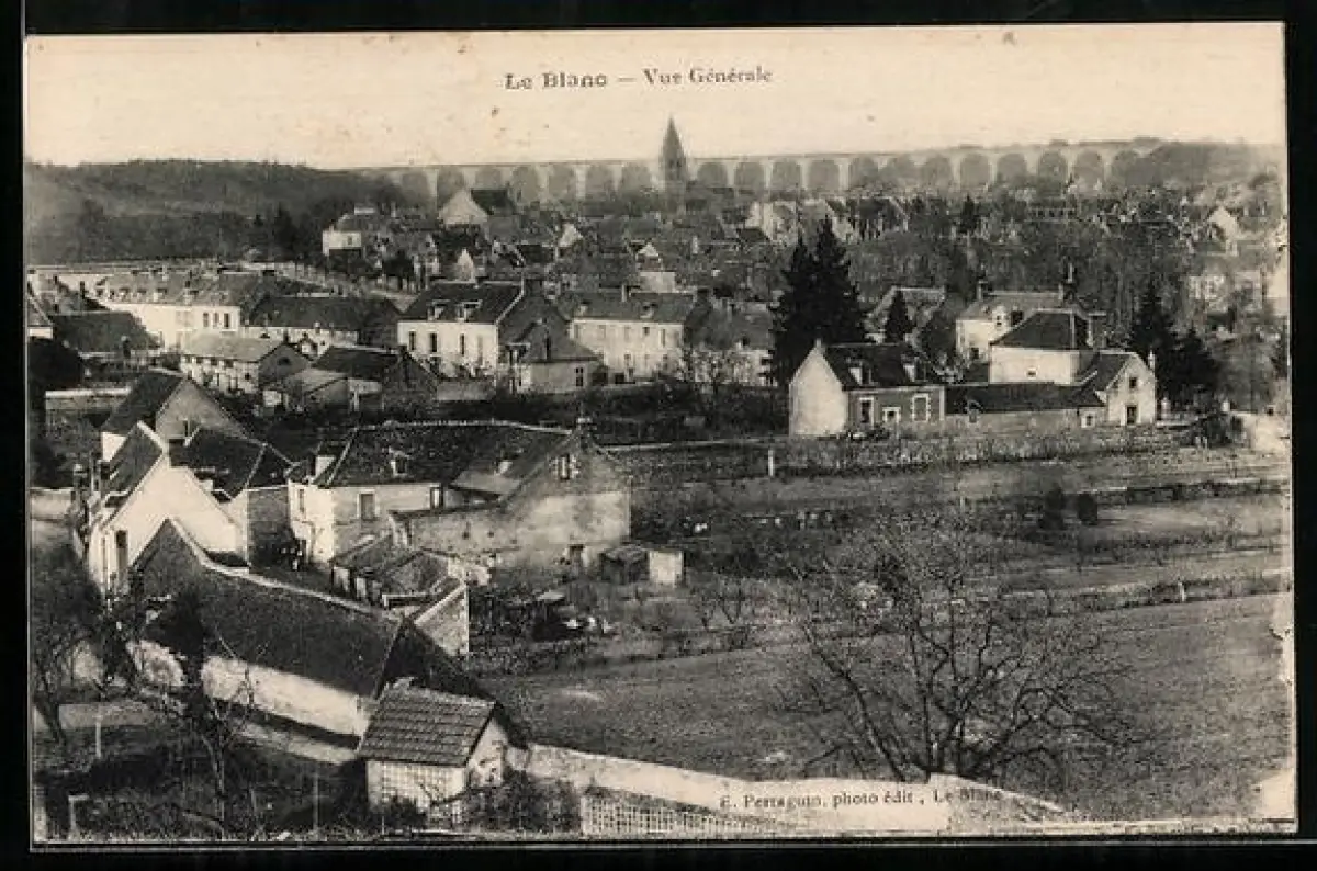 AK Le Blanc, Vue Générale du village avec viaduc en arrière-plan