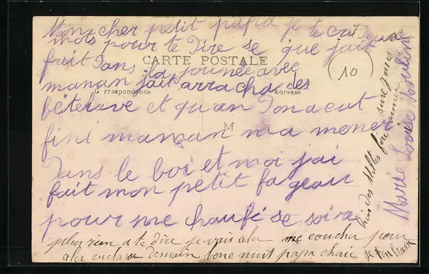 Personenbezogene Daten auf der Rückseite der Karte wurden durch blauen Textmarker unkenntlich gemacht. Die blauen Stellen sind auf die Vorderseite durchgeweicht und wirken sich negativ auf das Postkartenfoto aus