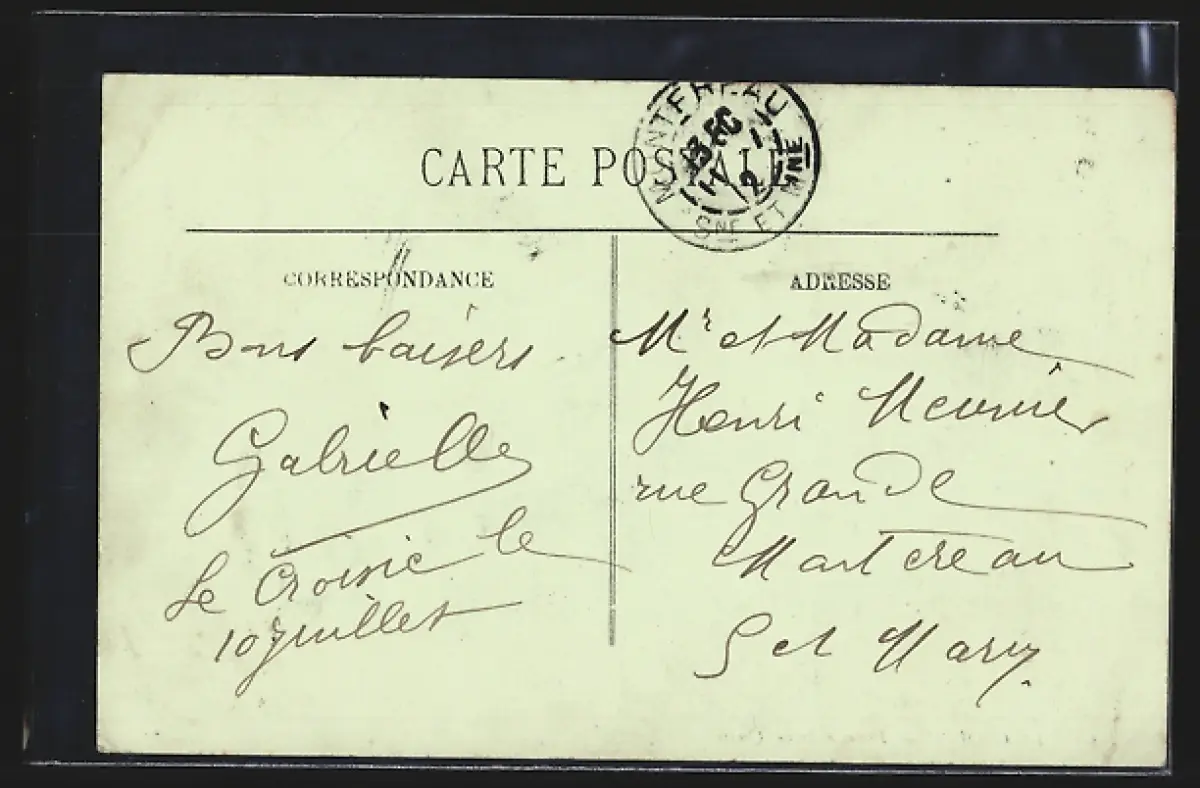 Personenbezogene Daten auf der Rückseite der Karte wurden durch blauen Textmarker unkenntlich gemacht. Die blauen Stellen sind auf die Vorderseite durchgeweicht und wirken sich negativ auf das Postkartenfoto aus