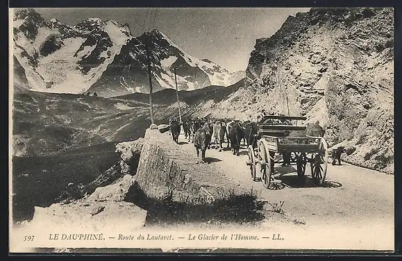 AK Le Dauphiné, Route du Lautaret, Le Glacier de l`Homme, un fiacre et un troupeau de vaches