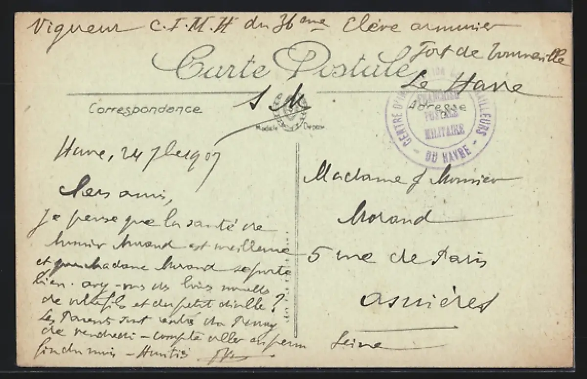 Personenbezogene Daten auf der Rückseite der Karte wurden durch blauen Textmarker unkenntlich gemacht. Die blauen Stellen sind auf die Vorderseite durchgeweicht und wirken sich negativ auf das Postkartenfoto aus