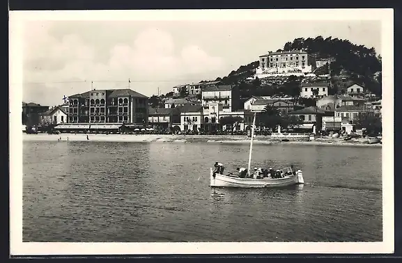 AK Le Lavandou, Vue sur la plage et le village avec bateau à voile