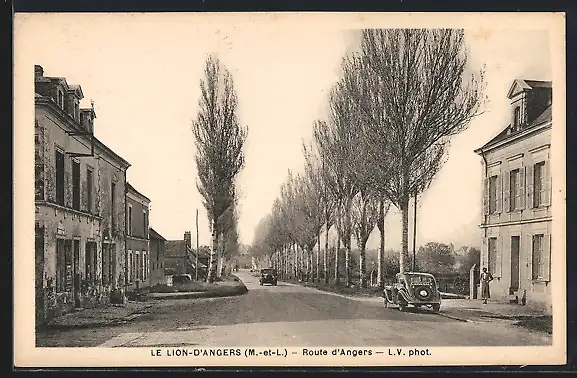 AK Le Lion-d`Angers, Route d`Angers avec arbres bordant la rue et voitures anciennes