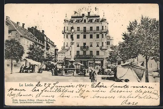 AK Le Locle, Strassenpartie mit Geschäft und Brunnen